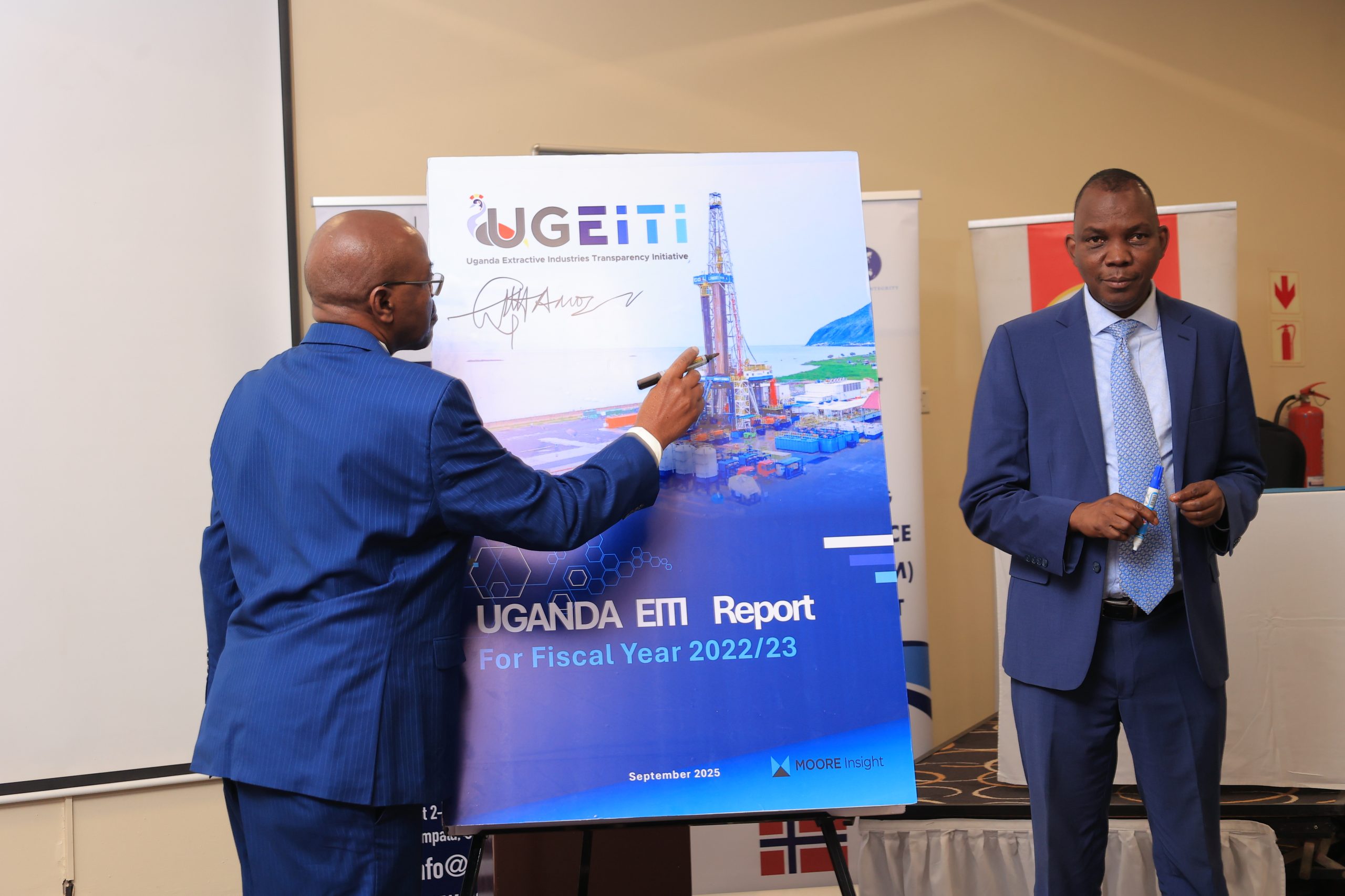 Minister of State for Planning (Hon. Amos Lugoloobi) Launches the Fourth Uganda Extractive Industries Transparency Initiative (EITI) Report for Fiscal Year 2022/2023 at Protea Hotel Kampala on November 20, 2025.